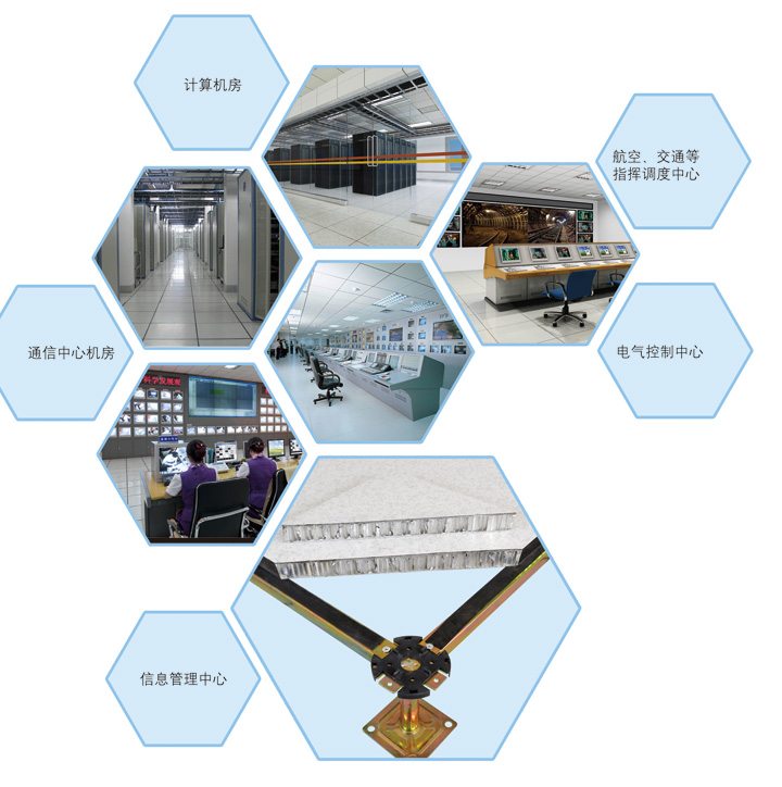 鋁蜂窩高架活動地板廣泛應用于計算機機房、數據處理中心、實驗室、微波通信站機房、程控電話交換機房、移動通信機房、衛星地面站機房、電臺控制機房、電視發射臺控制室、播控室、監控機房、中央控制室、通訊指揮中心、微電子元器件、半導體、電子產品組裝及大規模集成電路的潔凈車間,能避免人體在車間內移動產生靜電。控制靜電放電對計算機通信、各類電子設備及對靜電敏感器件危害,防止計算機內存及電子儀器內部的損壞。還用于對靜電敏感的軍火、易燃易爆的場所和石油化工車間及醫院手術室 、麻醉室、氧吧間及其它有防靜電要求的場所。產品已被世界五百強如三星、富士康、中石油、中國工商銀行、國家電網、西門子、飛利浦的知名企業使用。